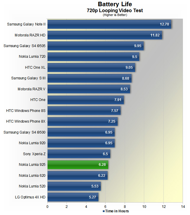 Comparing the Lumia 925’s battery life to other phones in a media playback test (phone in airplane mode, 75% brightness, looping 720p video, sound off) reveals this phone performs alongside a range of other Windows Phones. It didn’t manage to live for longer than eight hours, which if it did would signal the phone has great battery life, but nevertheless its score of over six hours isn't the worst I've seen.